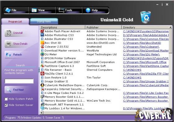 Uninstall Gold - программа для деинсталляции приложений, обладает большим количеством функций: показывает скрытые установленные программы, сортирует список программного обеспечения по заданному фильтру, удаляет некорректно инсталлированные и деинсталлированные программы.
