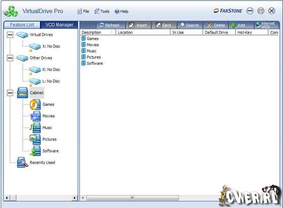 VirtualDrive — программа для создания виртуальных дисков (VCD), поддерживающая все необходимые функции. Позволяет значительно ускорить запуск файлов и приложений, конвертируя CD и DVD с важной для вас информацией в mp-3 файлы, которые запускаются вместо обычных дисков на одном из 23-х виртуальных приводов, созданных программой. Поддерживает ISO (воспроизведение образов). VirtualDrive архивирует виртуальные CD и DVD в удобную для поиска структуру. Вы сможете переписывать виртаульные диски на ноутбук, USB-устройство и распространять его по сети. Виртуальные диски позволят вам увеличить срок действия CD-ROM'ов, поскольку сохраняются прямо на жёсткий дик и, кроме того, повысить быстродействие в 200 раз, улучшая воспроизведение игр, дисков с фотографиями и запускаемыми приложениями.