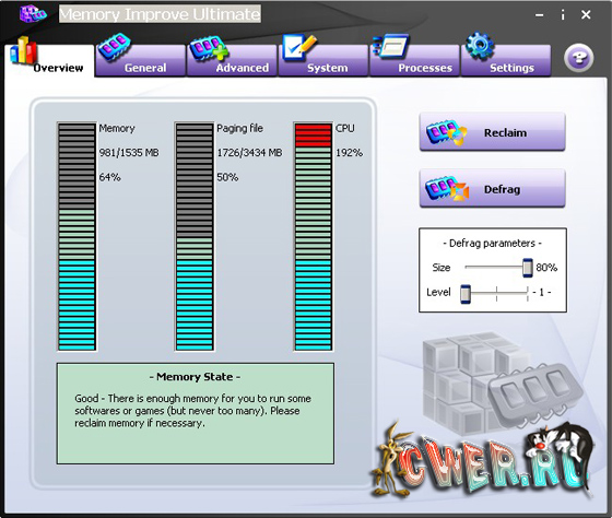 Позволяет увеличить быстродействие вашей системы за счет освобождения (дефрагментации) оперативной памяти. Имеется возможность установки минимального количество свободной оперативной памяти, при превышении которого запустится модуль и попытается удалить из оперативной памяти лишние процессы. Кроме этого, имеется возможность просмотра запущенных процессов, наблюдение за нагрузкой на ЦП и множество других полезных настроек.