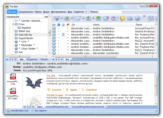 The Bat! - это лучшая почтовая программа, которая обладает рядом жизненно необходимых и просто удобных возможностей, значительно облегчающих работу с электронной почтой. Все эти функции превосходно работают на компьютерах с любой операционной системой Windows. Необходимо отдельно отметить, что The Bat! – первый почтовый клиент, сертифицированный корпорацией Microsoft для работы с операционной системой Windows Vista. Логотип Certified for Vista гарантирует высочайший уровень совместимости всех механизмов программы с этой новейшей операционной системой.