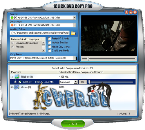 1Click DVD Copy - простой и быстрый инструмент для копирования видео DVD. Подойдёт как начинающим пользователям, (так как очень прост), так и продвинутым... Важно не то, что она обладает простым, но эргономичным интерфейсом и быстро работает, а то, что именно эта программа выдает наилучшее качество изображения при копировании среди себе подобных. Даже при 40% сжатии копия практически неотличима от оригинала.