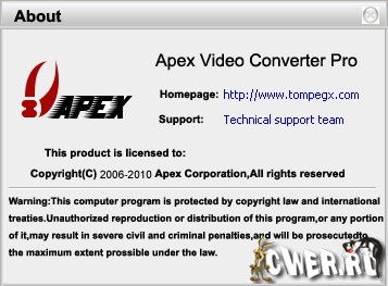 Профессиональный конвертер видео файлов из одного формата в другой. Apex Video Converter Pro поддерживает конвертацию форматов AVI, DivX, XviD, MPEG, WMV, MOV, ASF, QuickTime, RM, RMVB, DVD, SVCD, VCD, MPEG-1, MPEG-2 и других.
