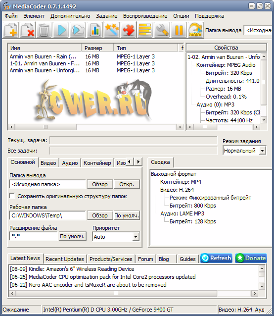 MediaCoder - позволяет повысить компрессию видео и аудио с целью уменьшения размеров файла, может извлекать аудиотреки, предоставляет возможности для конвертирования видео в нормальные VCD/DVD, может осуществлять конвертирование аудио без заметной потери качества, способен создавать копии CD "на лету" и многое другое.