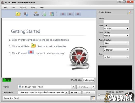 ImTOO MPEG Encoder Platinum - самый мощный из линейки от ImTOO Software Studio, высококачественный конвертор широкого спектра видео-файлов . Позволяет конвертировать файлы любых форматов, таких как AVI, MPEG, DivX, WMV, MP4, MOV, FLV, 3GP, PSP MPEG-4, iPod MPEG-4 и т.д. Помимо этого программа может извлекать аудиодорожку из видео-файлов, конвертировать большинство популярных звуковых форматов, таких как MP3, WMA, WAV, AAC, M4A и т.д. С помощью ImTOO MPEG Encoder можно быстро и с высоким качеством конвертировать любой файл в мобильные форматы 3GP, FLV, PSP, Zune, iPod, iPhone, Apple TV для дальнейшего использования в портативных устройствах. Имеется два режима работы программы: расширенны и пошаговый, с помощником. Начинающему пользователю легче работать в пошаговом режиме, а опытному пользователю предоставляется возможность использовать множество настроек для конвертирования видео в расширенном режиме.