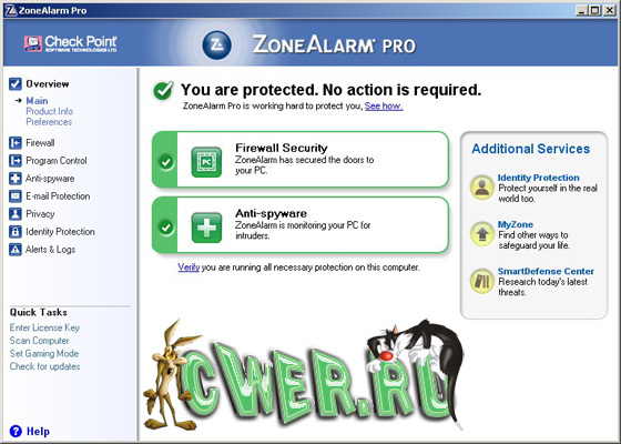 ZoneAlarm Pro - хорошо известный фаерволл, один из лучших в мире на сегодняшний день. Защищает компьютер от внешних угроз при работе в интернете и локальной сети. Блокирует атаку, не давая возможность получить доступ к компьютеру пользователя, имеет режим "стелс" невидимки в сети. Перекрывает выход в Интернет шпионским программам для пересылки личной информации. Защищает программы и операционную систему от вредоносного программного обеспечения и пр. Как необязательное дополнение в файерволл встроена антивирусная Anti-Spyware программы.