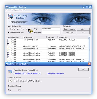 Product Key Explorer - позволяет расшифровать и увидеть, а также сохранить серийные номера (Product ID, Product Key, License Info, User Name, Company) продуктов Microsoft, CD-key установленных на компьютере программ, и не только их. Неполный список ПО, регистрационные данные которых можно увидеть и сохранить: Micrsoft Windows (2000, XP, 2003, Vista), Microsoft Office 2003, Microsoft Office 2007, Microsoft Office XP, Micrsoft Visual Studio 2005, Macromedia, Ahead Nero, Adobe Photoshop, CyberLink PowerDVD, Borland Delphi и т.д.