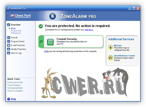 ZoneAlarm Pro является персональным файрволом и предназначен для защиты компьютера от разного рода угроз при работе в интернете и локальных сетях. Ограничивает доступ к компьютеру из сети и позволяет контролировать доступ в сеть программного обеспечения, установленного на компьютере. Помимо этого, он может контролировать исходящие данные и пресекать отправку нежелательной информации по почте или через web-интерфейс. ZoneAlarm контролирует входящую и исходящую почту. Во входящей почте он может переименовывать потенциально опасные вложения и помещать их на карантин. Количество исходящей почты может быть ограничено для предотвращения массовых рассылок при заражении компьютера почтовыми червями, что в сумме с контролем за приложениями препятствует работе червей. Файрвол может удалять с посещаемых страниц рекламу, экономя трафик и уменьшая время загрузки страниц. Блокировка скриптов и активного содержимого поможет предотвратить заражение компьютера при посещении определенных веб-сайтов.