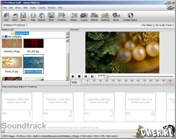 Photodex ProShow Gold - самая популярная программа которой пользуется подавляющая часть профессиональных фотографов. Программа удовлетворяет своими возможностями по всем критериям, как ни одна из существующих программ аналогичного направления.Программа позволяет создавать качественные слайд-шоу и обладает рядом дополнительных приятных возможностей. ProShow Gold может создать Видео CD диск (VCD, SVCD, XVCD, XSVCD, CVD) с помощью которого Вы сможете просмотреть на своем телевизоре любимые фотографии. Умеет записывать исходные изображения в виде MPEG-видеофайлов, поможет сделать хранитель экрана (ScreenSaver) для себя или друзей, а также выполняемую программу слайд-шоу, для просмотра которого не требуется установки на компьютер какого-либо дополнительного аппаратного или программного обеспечения.