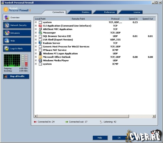 Sunbelt Personal Firewall - представляет собой надёжную, легкую в использовании персональную технологию безопасности, которая полностью защищает персональный компьютер от хакерских атак и утечки данных. Для большей гибкости настройки предусмотрена установка временных интервалов, когда будут действовать отдельные правила. Кроме этого, выдает сообщение о попытке соединения или сканировании портов компьютера. Программа обладает удобным многоязычным интерфейсом, что позволяет освоить ее за несколько минут.