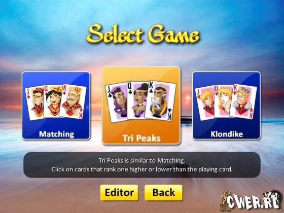 Это игра-пасьянс для Windows. Включает более 110 забавных уровней и три различных типа пасьянса в одной: "Клондайк", "Три Пики" и "Соответствие"!