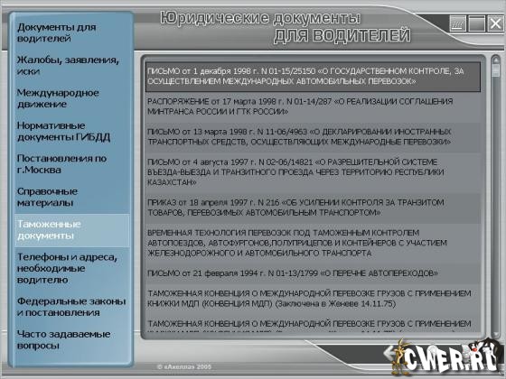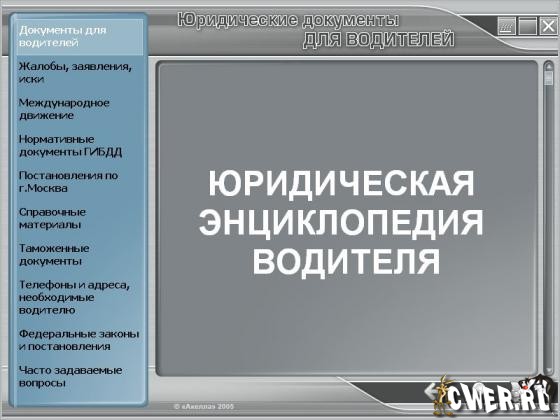 Этот диск - справочно-практическое пособие для водителей. В нем собраны самые важные вопросы юридической практики в сфере дорожного движения. Основные источники информации - базы данных ГИБДД и Федеральной таможенной службы РФ. Дополнительно приведены сведения, полученные от ведущих дилеров и производителей автомобилей. На диске можно найти все правовые акты, необходимые автовладельцу, - федеральные законы, акты международного права, таможенные документы, постановления Правительства. В качестве бонуса приведены рекомендации по составлению типовых жалоб и исковых заявлений.