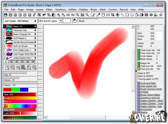 TwistedBrush - программа для художников. Она имеет большое количество самых разнообразных инструментов для рисования, от красок до мелков и карандашей. Эта программа глубоко поражает буквально с первого запуска. Интерфейсом Twisted-Brush мало похож на другие редакторы, хотя и предоставляет все необходимые возможности: работа с буфером обмена, зуминг и, конечно же, рисование. Причем рисующий инструмент только один — кисточка, зато количество (более 3000 штук!!!) и качество пресетов для рисования, а также многообразие форм и регулируемость размеров и цветовой гаммы позволяют человеку, не особо одаренному художественными талантами, буквально за пару минут изобразить то, что — возможно, более аккуратно и качественно, конечно — профессионал, работающий в другом редакторе, рисовал бы, наверное, не один час.