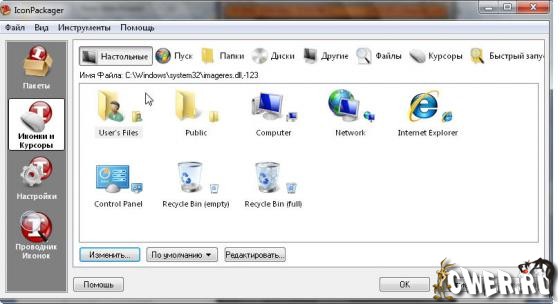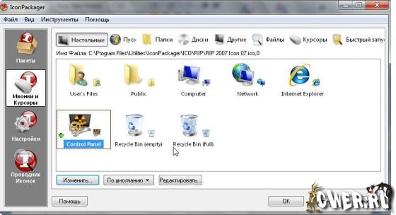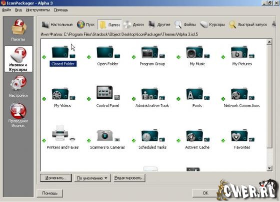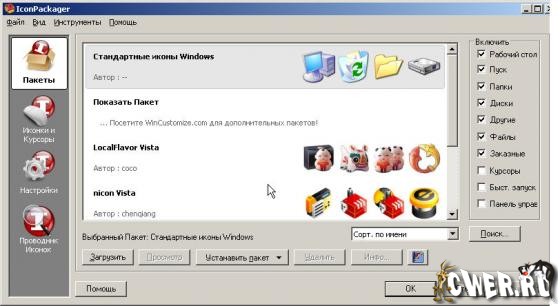 Установка в этом случае не вызывает трудностей. Достаточно дважды кликнуть по файлу [file.ip] в первом случае или по файлу [file.iconpackage] во втором и третьем случае. Откроется окно программы IconPackager с вашим открытым пакетом, где нажимая на вкладки Настольные, Пуск, Папки, Диски и т.д., вы можете посмотреть как будет выглядеть ваша система после применения пакета.