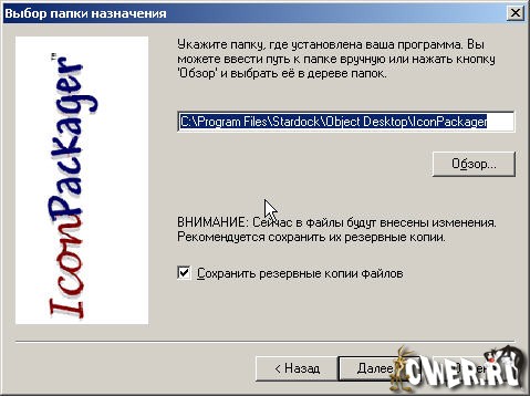 1.4. Запустите файл RUS.exe и установите русификатор в папку с установленной программой (по умолчанию - C:\Program Files\Stardock\Object Desktop\IconPackager). На всякий случай галочку перед "Сохранить резервные копии файлов" не снимайте.