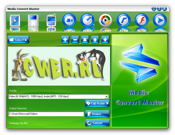 Media Convert Master - умеет конвертировать файлы из одного видеоформата в другой. Причём делает всё это с огромным числом популярных форматов: AVI, MP4, 3GP, MPEG, MOV, WMV, RM, SWF, AAC, AC3, MP2, MP3, AMR, WAV, VOB, ASF.
