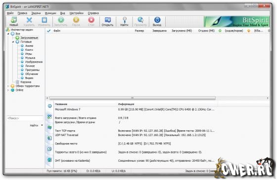 BitSpirit - мощный и удобный в использовании клиент BitTorrent, который не только работает по этому протоколу, но также имеет ряд дополнительных возможностей. Среди них следует отметить: удобный и понятный интерфейс, возможность работы сразу с несколькими закачками, механизм кеширования данных на диск, быстрое восстановление работы, поддержка выбора файлов, удобный файловый менеджер, поддержка опции обмены сообщениями, компрессия по алгоритму GZip, работа по расписанию, интеграция в IE, поддержка HTTP/SOCKS4/5 Proxy, малая требовательность к ресурсам ПК.