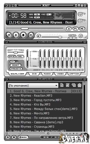 - KMPlayer — полностью настраиваемый плеер, предлагающий широкий ряд скинов и цветового оформления