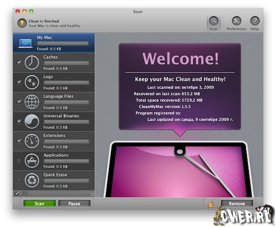Основная специализация CleanMyMac — очистка компьютера от разного ненужного хлама, к которым можно отнести кэши программ, лог-файлы, ненужные локализации программ, лишний код и т. д. Все данные, которые CleanMyMac считает лишними, визуально сортируются по разным категориям. Это дает возможность наглядно оценить, где можно выиграть сотню-другую мегабайт и произвести соответствующую очистку. Из других возможностей CleanMyMac надо выделить удаление программ со всеми их служебными файлами; безопасное удаление файлов; поиск и удаление виджетов и пультов.