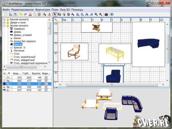 Во время работы можно использовать 3D-модели, которые в большом количестве представлены на официальном сайте и доступны для бесплатной загрузки. Программа дает возможность предварительного просмотра интерьера в 2D (вид сверху), а также может визуализировать конечный вариант расстановки мебели в 3D.