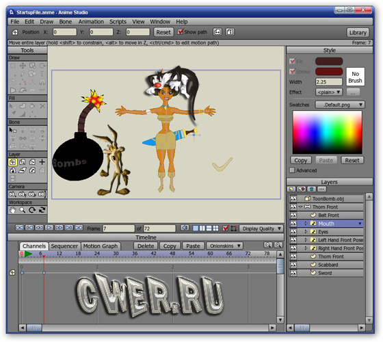 Anime Studio Pro - профессиональная программа (раньше называлась Moho), позволяющая достаточно быстро и просто создавать анимированные персонажи для видео или веб. За кажущейся простотой скрываются достаточно мощные средства для анимации 2D персонажей. Anime Studio имеет интересный рендер, приспособленный не только для Flash роликов, но и для видео; в возможности визуализации для видео при этом включены различные эффекты, позволяющие придать анимации большую выразительность.