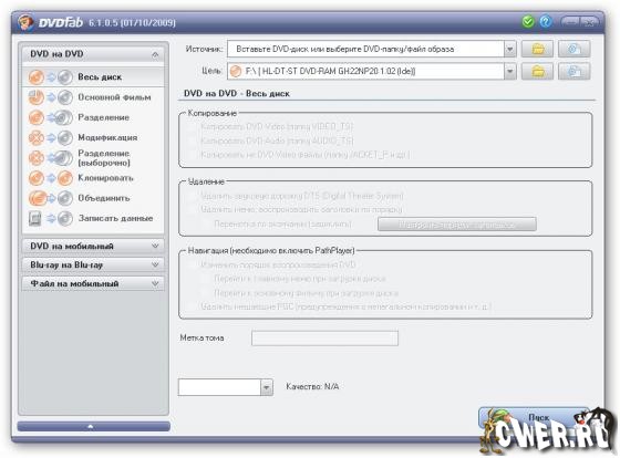 DVDFab – мощный, многофункциональный программный продукт для копирования DVD дисков с возможностями гибкой обработки видеопотока. Программа является одной из лучших на сегодняшний день, из инструментов для копирования, разбиения, пережатия и конвертирования DVD дисков с фильмами. Снимает все защиты и ограничения с диска и при желании пережмет диск большой емкости и вместит его в обыкновенную пустую DVD болванку с минимальными потерями качества (DVD9->DVD5) или разобъет фильм на два диска с полным переносом его меню, удалит всю рекламу, запишет только фильм и многое другое. Программа имеет интуитивно понятный, мультиязычный интерфейс включая русский.