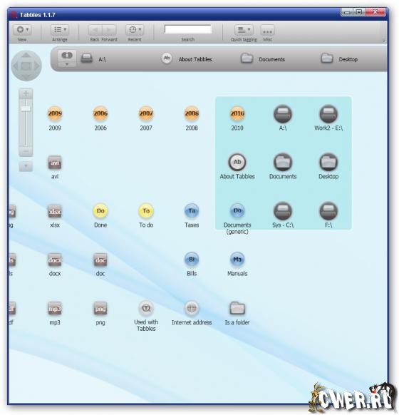 Даже если вы и очень организованный человек, рано или поздно вы можете столкнуться с проблемой "в какой папке сохранить этот файл?"… "вспомню ли я позже, где этот файл, если сохраню его в этой папке?"... "может, сделать копию этого файла?". С программой Tabbles таких проблем не возникнет! Tabbles позволяет категоризировать файлы и папки, сохраняя их в тэбблах (тэгах), а затем вы сможете их найти просто вспомнив, о чем был тот или иной файл и таким образом, быстро и просто отыскать нужный вам тэббл.