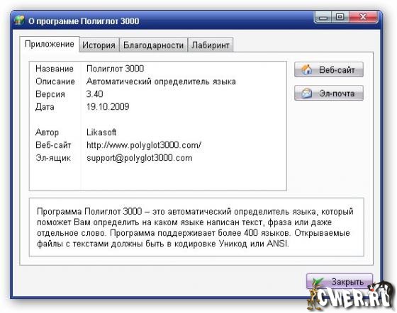Полиглот 3000 (или сокращённо П3000) – это автоматический определитель языка, который предназначен для быстрого и корректного определения того на каком языке написан введённый Вами текст. Программа работает в операционных системах Windows 95/98/NT/ME/2000/XP