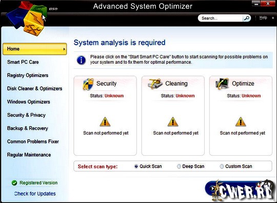 Advanced System Optimizer - пакет для настройки и оптимизации операционной системы - позволяет изменять скрытые параметы ОС, очищать жесткий диск от "приватной" информации, проводить резервное копирование системных файлов, а также исправлять ошибки в системном реестре и выполнять его дефрагментацию - всего порядка тридцати утилит.