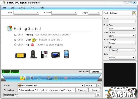 ImTOO DVD Ripper Platinum - мощная программа для копирования DVD, которая поможет Вам быстро преобразовать DVD в любой формат видео файлов. Программа совмещает функции DVD - риппера и DVD - аудиориппера, т.е. она сможет конвертировать DVD во все популярные форматы видео, такие как AVI, MPEG, WMV, DivX, RM, MOV, MP4, 3GP, 3G2, Xvid, ASF и т.п. и популярные аудио форматы - MP3, WAV, WMA, AAC, AC3, M4A, MP2, OGG. Поддерживает конвертацию для iPod, мобильных телефонов, PSP, DVD, MP3 и MP4 плееров.