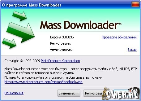 MetaProducts Mass Downloader - программа для удобного скачивания файлов из Интернета по протоколам HTTP и FTP, созданная на базе Offline Browser, разница только в том, что менеджер закачки загружает указанные пользователем файлы, а оффлайн-браузер - все файлы сайта. Программа разбивает закачиваемый файл на части и качает все части одного файла одновременно, тем самым увеличивая скорость. Может автоматически соединиться с провайдером, закачать файл и отключиться. Также позволяет докачивать файл после разрыва соединения (при условии, что сервер поддерживает докачку). Поддерживаемые протоколы HTTPS, FTP, RTSP, MMS, MMST и PNM. Имеется интеграция с веб браузерами Internet Explorer, Opera, Netscape Navigator, Mozilla, Firefox, Seamonkey и Flock. Программа имеет многоязычный интерфейс, включая русский язык и поддерживает работу с Windows Vista.