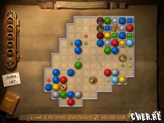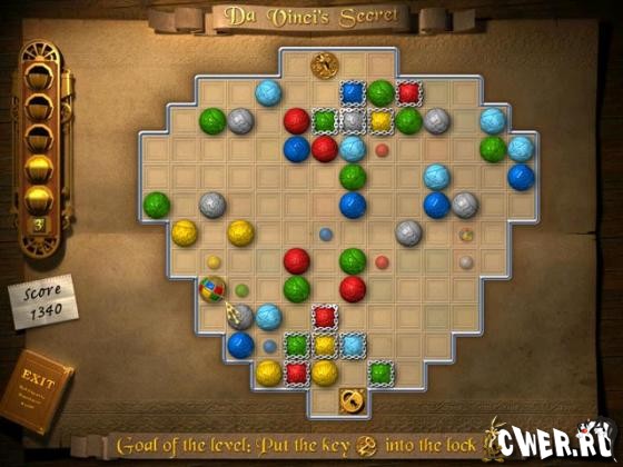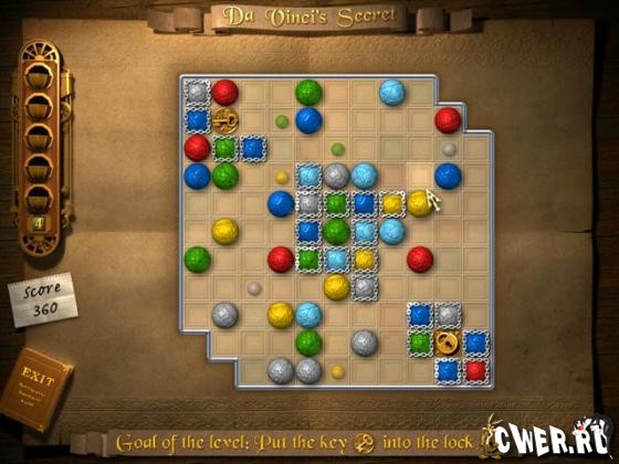 В этой игре вам предстоит разгадать секрет великого Леонардо да Винчи и найти легендарную святыню — Священный Грааль. Но добраться до него будет совсем непросто. Для этого необходимо собрать особые Знаки Силы, которые спрятаны в запутанных лабиринтах, наполненных разноцветными фишками. Чтобы получить заветные знаки, нужно при помощи специальных ключей открыть замки, запирающие выходы из лабиринтов.