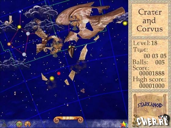 Абсолютно новый подход к жанру арканоид. Эта игра не предложит вам традиционных блоков и кубиков. Вместо них вам предстоит разбивать скульптуры созвездий, чтобы увидеть за ними звезды их образующие. В этой игре вас ждет графика, рисованная вручную, а также приятные мелодии в древнегреческом стиле. Вам предоставляется уникальная возможность увидеть созвездия с точки зрения современной науки и античности. В игре более 20 уникальных уровней и 14 бонусов-усилений.