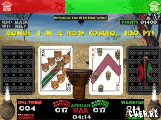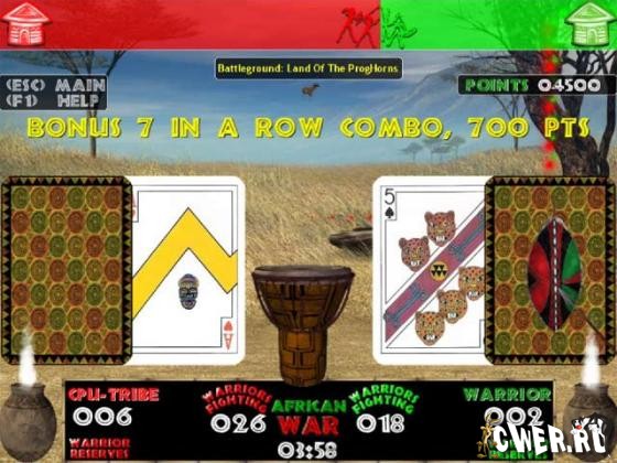 Увлекательная карточная война на фоне потрясающего африканского ландшафта несомненно привлечет ваше внимание ошеломляющей 3D графикой, эффектами и оригинальной музыкой африканских племен. Из четырех режимов игры вы можете выбрать как быструю схватку, так и продолжительные военные действия, которые будут идти до тех пор, пока один из игроков не захватит в плен всех оставшихся воинов. Это война!