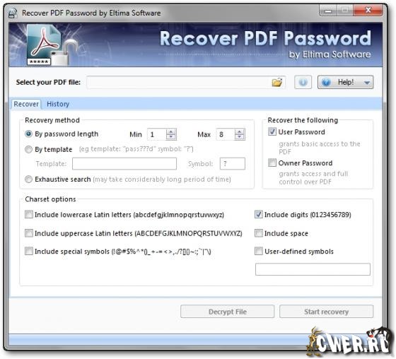 Recover PDF Password - поможет восстановить пароль к PDF документам. Вы потеряли или забыли пароль к своему PDF документу? Такое может случится с каждым! Но восстанавливать заново этот документ может быть очень сложно. На помощь к вам придет Recover PDF Password. Не важно, старый или новый ваш PDF документ, Recover PDF Password поддерживает абсолютно все версии Adobe Acrobat и восстанавливает даже Unicode пароли для защищенных файлов Acrobat. PDF документ может быть защищен паролем пользователя или паролем владельца. Если вы не знаете пароль пользователя, то не сможете открыть документ, а если не знаете пароль владельца, то не сможете распечатывать, копировать и редактировать документ. Recover PDF Password поможет вам восстановить любой из этих паролей, даже если они длинные и сложные. С помощью программы Recover PDF Password вы сможете расшифровать PDF документ и использовать его без паролей и ограничений. Если документ защищен только паролем владельца, просто нажмите кнопку “Decrypt” и все ограничения на пользование документом будут удалены!