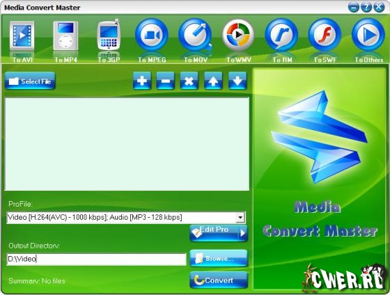 Media Convert Master - профессиональный аудио/видео-конвертер, конвертирует ваши аудио- и видео- файлы из одного формата в другой. Поддерживается мультиформатное конвертирование, в частности AVI, MP4, 3GP, MPEG, MOV, WMV, RM, SWF, AAC, AC3, MP2, MP3, AMR, WAV, VOB and ASF. Экстремально профессиональное конвертирование с наиболее высоким качеством и скоростью! Благодаря простоте в управлении программа позволяет пользователю наслаждаться процессом конвертирования файлов.