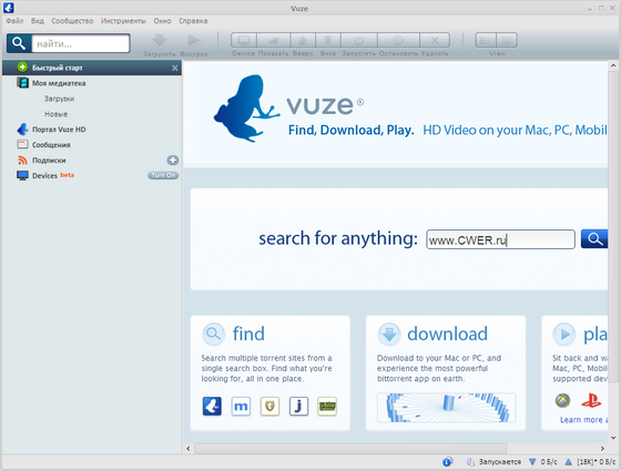 Vuze - это популярная программа для работы в Peer 2 Peer сети BitTorrent со значительно более богатым ассортиментом функций, чем фирменный клиент сети. По большому счету все богатство функционала заключается в более продвинутом подходе к управлению закачками, чему способствует симпатичный и удобный интерфейс. Немаловажным достоинством является наличие функций трекера — возможность поиска torrent файлов. Стоит упомянуть поддержку плагинов, кои можно скачать с сайта разработчика.