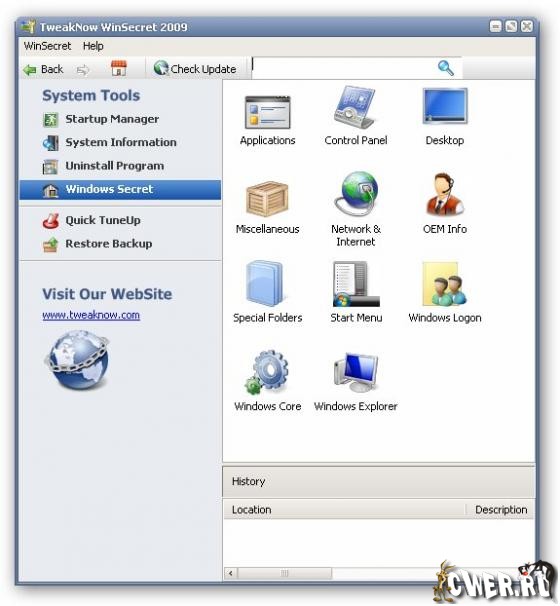 TweakNow WinSecret 2009 - утилита для тонкой настройки Windows. TweakNow WinSecret 2009 содержит наиболее востребованные параметры для изменения настроек операционных систем Windows XP/Vista/7. Все параметры разделены по категориям: приложения, панель управления, рабочий стол, сеть и Интернет, информация о компьютере, учетные записи пользователей, ядро Windows и различные другие настройки. Если работа программы приведет к нежелательным последствиям, то можно сделать откат, используя соответствующую функцию, что вернет все настройки на прежние.