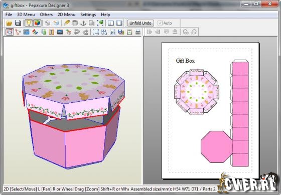 Pepakura Designer - программа от японских разработчиков, предназначенная для создания бумажных моделей из 3D данных. Является единственной в этом направлении программным обеспечением для создания бумажных моделей из трехмерных файлов. Программа поддерживает различные форматы 3D моделей, включая 3DS, DXF, MQO, LWO, OBJ, STL, KML, KMZ и т.д. В программе не имеется возможности создания самих трехмерных моделей и не имеется никакого редактора 3D моделей, но вместо этого программа позволяет переводить трехмерные модели в 2D формат для последующей печати на принтере.