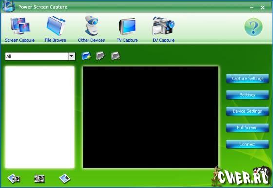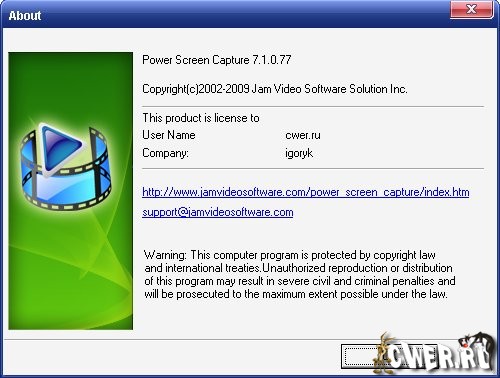Power Screen Capture - мощная программа захвата всего что происходит на экране монитора с высоким качеством а так же захвата изображений с различных устройств типа DV видео и вэб-камер, TV тюнеров и прочих девайсов, в режиме реального времени. Возможна установка выходных параметром захваченного материла: видео и аудио кодеков, размер рамки и кадров в секунду и пр. Присутствует так же возможность нанесения водяных знаком и текстовых надписей.