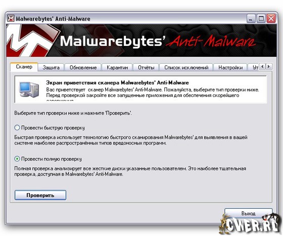 Malwarebytes' Anti-Malware - новая версия программы от создателей RogueRemover Pro, AboutBuster и других популярных утилит, способная находить и удалять разнообразные вредоносные программы. Программой используется эвристический метод сканирования, позволяющий в реальном времени контролировать безопасность всей системы. Также имеется возможность полного сканирования всех дисков. Помимо этого, в состав данной программы входят дополнительные утилиты, предназначенные для удаления вредоносных программ вручную. Обладает понятным пользовательским интерфейсом с многоязычной поддержкой, включая поддержку русского языка.