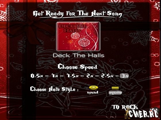Помогите сыграть Санте на гитаре рок музыку под овации аплодисментов. Помощь заключается в том, что Вам необходимо вовремя нажимать клавиши от 1 до 5 при приближении фишек.