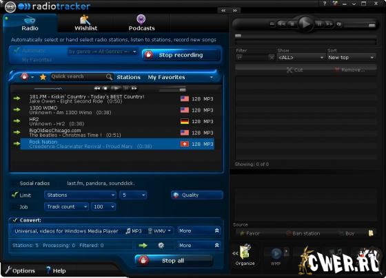 RadioTracker - программа, использующая около 15.000 интернет-радио станций для прослушивания и записи музыки в формате mp3. Возможности программы довольно велики: поиск нужной музыки, разбивка на разные жанры, при сохранение треков сохраняется и вся информация об исполнителе и прочая нужная информация, возможность использования фильтров для очистки от рекламы и прочих шумов на радио.