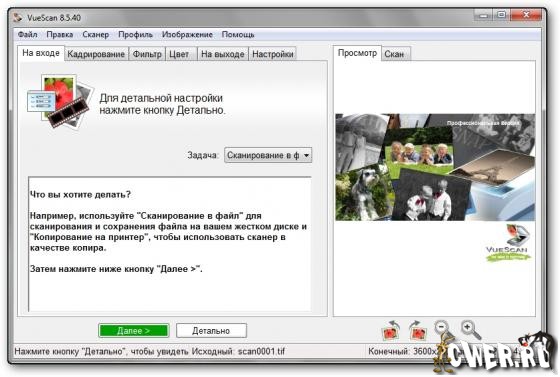 VueScan Pro - программа для работы со сканерами HP, Minolta, Nikon, Polaroid, Epson, Canon и другими. Может работать с внутренней глубиной цвета. VueScan поддерживает автоматическую и ручную настройку большинства параметров и пакетный режим сканирования. Поддерживается более 500 моделей сканеров с определенным перевесом в сторону слайд-сканеров — Nikon, Minolta, Polaroid, Microtek, Epson. Предусмотрено автоматическое удаление дефектов изображения за счет канала инфракрасного сканирования и многопроходное сканирование с последующим усреднением результата — для подавления собственных шумов сканера. Имеются фильтры подавления зерна, нерезкого маскирования и удаления паразитного оттенка оригинала. Есть средства ручной корректировки динамического диапазона и градационной характеристики (независимо по каналам R, G, B).