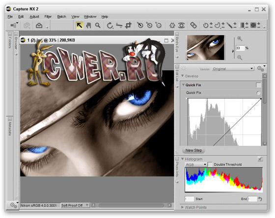 Программа позволит Вам многократно создавать и изменять операции по обработке изображения, без ухудшения исходных данных изображения и обеспечивает полностью совместимый и непрерывный процесс редактирования файлов в формате JPEG или TIFF с Вашей фотокамеры. Для тех, кто использует формат NEF (RAW), доступны также специальные средства для коррекции оптических или цифровых артефактов изображения, таких как вносимая объективом дисторсия или виньетирование.