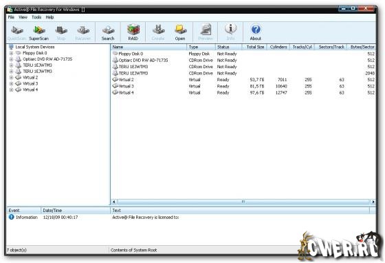 Active@ File Recovery - легкий в использовании, безопасный и эффективный инструмент для восстановления потерянных файлов. Программа обеспечивает восстановление данных в результате случайного удаления, повреждения, вирусной атаки или форматирования. Поддерживает работу с файловыми системами FAT12, FAT16, FAT32, NTFS, NTFS5 и NTFS+EFS. Программа позволяет восстанавливать большое количество файловых расширений, включая графические файлы, документы, архивы, презентации PowerPoint, файлы Corel Draw и многие другие. Кроме того, программа поддерживает большинство типов переносных/портативных устройств, включая CompactFlash, SmartMedia, Secure Digital/MultiMediaCard, карты памяти Sony, Iomega ZIP и т.д. File Recovery позволяет проделывать быстрое и расширенное сканирование дисков. Программа умеет работать напрямую с жестким диском, может создавать образы дисков для переноса данных на другие HDD или резервного копирования. Также имеется поддержка RAID массивов и томов.