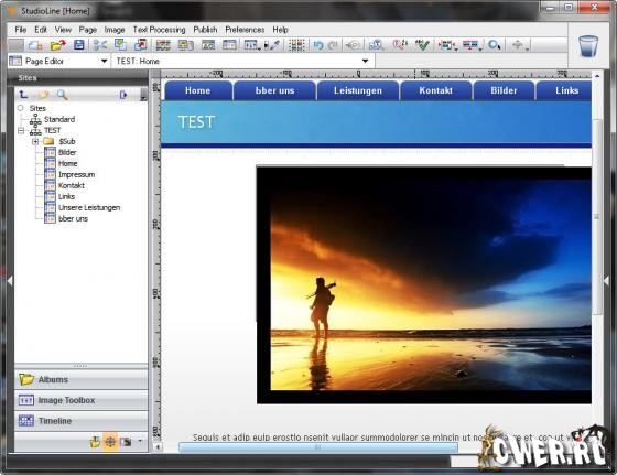 StudioLine Web integrates all functions for designing, publishing and maintaining professional web sites into a single user interface – layout editor, page editor, image archive, image editing, graphics and text effects, picture galleries, file transfer and site management. An absolute novelty – you easily edit your images, apply special effects and arrange them as collages directly on your page and immediately view the outcome. With StudioLine Web you realize your web designs in a snap: Images and text are positioned freely and remain editable. In three steps, your page is published to the Internet.