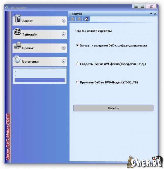 Video DVD Maker может создавать DVD на основе видеофайлов в форматах AVI, DIVX, XVID, MP4, MPG, WMV, ASF, MOV, а также выполнять захват видео с ТВ-тюнера, веб-камеры, DV-камеры и других устройств. Работа программы организована в виде пошагового мастера, и процесс создания диска разбит на три этапа: захват видео, добавление дополнительных файлов, запись DVD. Программа поддерживает запись на любые типы дисков, в том числе двухслойные DVD. Русский интерфейс присутствует.