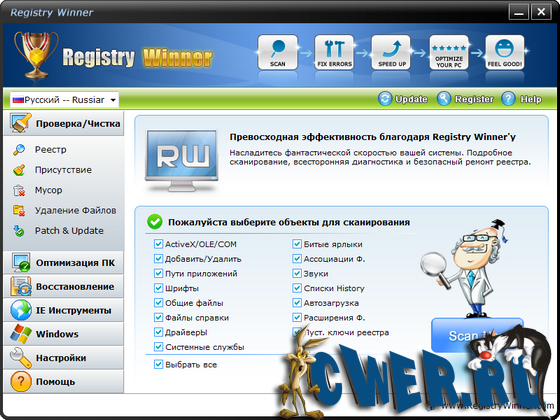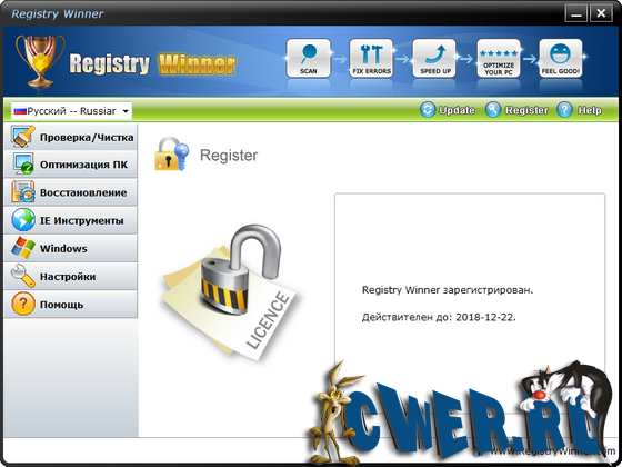 Registry Winner – программа для улучшения работы компьютера, которая находит ошибки, оптимизирует систему и ускоряет ее. Вы можете столкнуться с различными проблемами, которые постепенно появляются с использованием компьютера, например, замедление, зависание, «голубой экран смерти», постоянные сообщения об ошибках и т.д. Registry Winner использует только самые продвинутые технологии для сканирования ваших жестких дисков и дает вам наиболее полную диагностику всего за несколько секунд. Как только проблемы обнаружены приложением, Registry Winner предложит вам профессиональное и высокоэффективное решение для вашего компьютера.