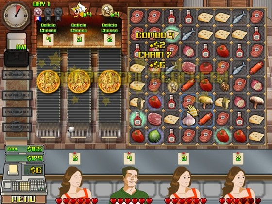 В этой игре вам предстоит открыть пиццерию. Начнёте вы свой нелёгкий путь к вершинам кулинарного бизнеса в небольшом городке, всего с несколькими рецептами в меню, простым оборудованием, но как только пойдёт доход, улучшите свой ресторанчик. В этой игре "3-в-ряд" вы будете выполнять заказы посетителей. составляя цепочки из начинки. Как только пицца будет готова вы сможете дополнить заказ салатом и напитками, чтобы заработать побольше чаевых.