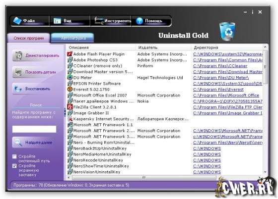 Uninstall Gold - программа для деинсталляции приложений, обладает большим количеством функций: показывает скрытые установленные программы, сортирует список программного обеспечения по заданному фильтру, удаляет некорректно инсталлированные и деинсталлированные программы.